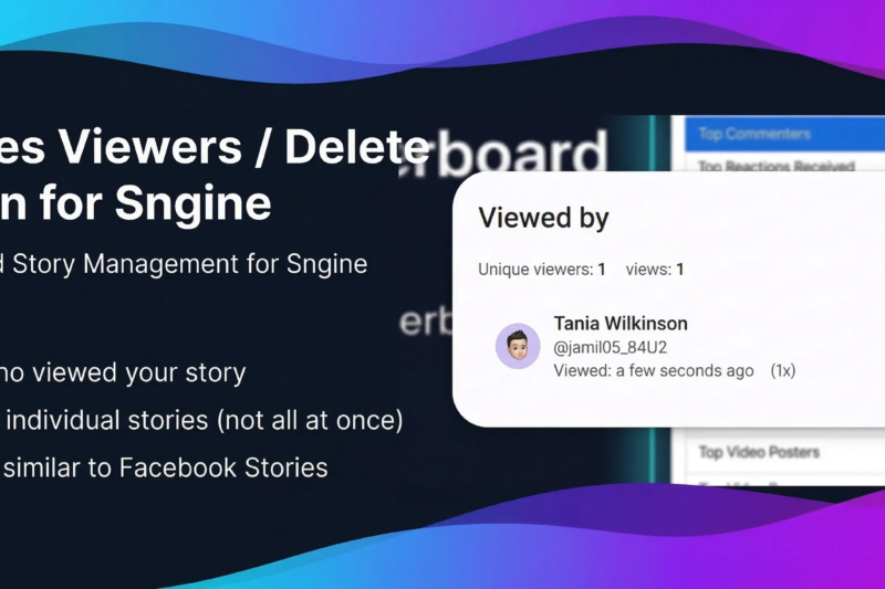 The Stories Viewers / Delete Plugin for Sngine enhances the default Stories system by giving story owners more control … Stories Viewers / Delete Plugin for SngineRead more