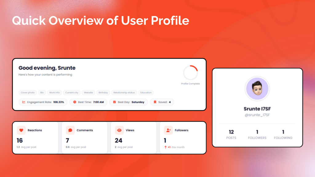 • Profile Sidebar Card: User avatar, name, username, and key stats (posts, followers, following)