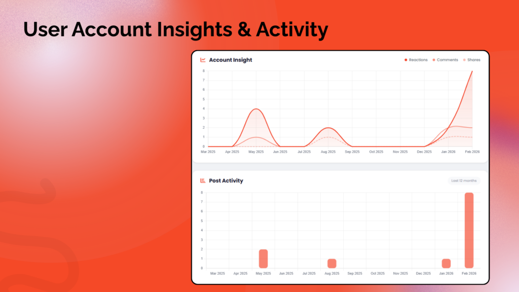 • Post Activity Chart: Bar chart showing posting frequency over the last 12 months