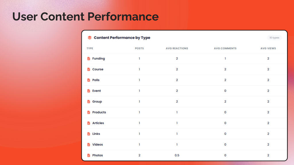 • Content Performance by Type:  Table showing average reactions, comments, and views per content type