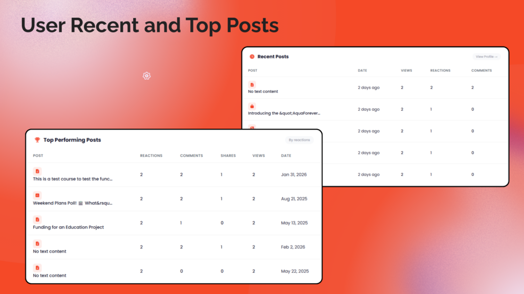 • Recent Posts:  Latest 5 posts with engagement stats and post type icons