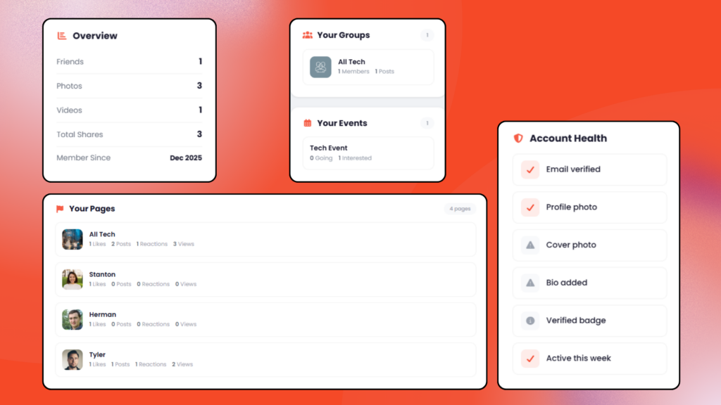 • Account Health Checks:  Visual checklist for email verification, profile photo, cover photo, bio, verified badge, and recent activity