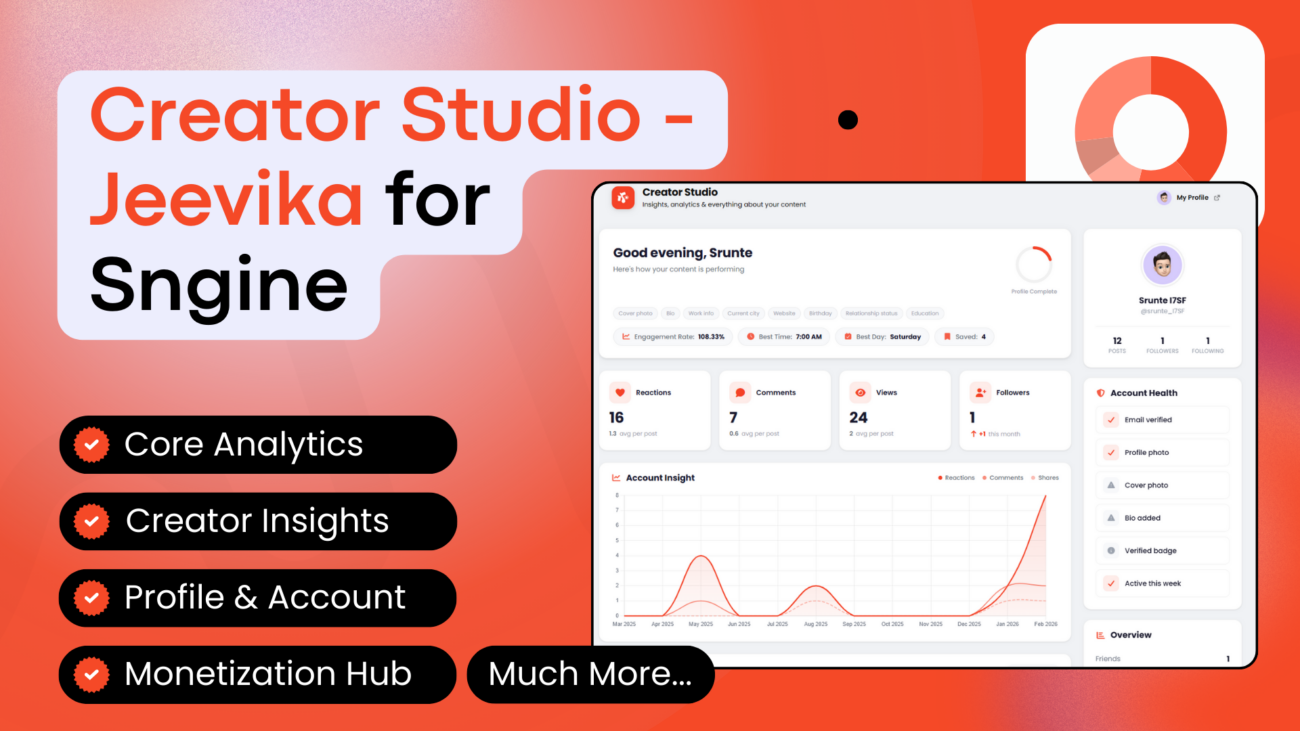 Jeevika is a powerful Creator Studio & Analytics Dashboard plugin for the users of Sngine-powered social networks. The plugin gives every logged-in user a comprehensive analytics hub featuring engagement insights, content performance breakdowns, monetization tracking, account health checks, and much more. Accessible directly in the user header menu.