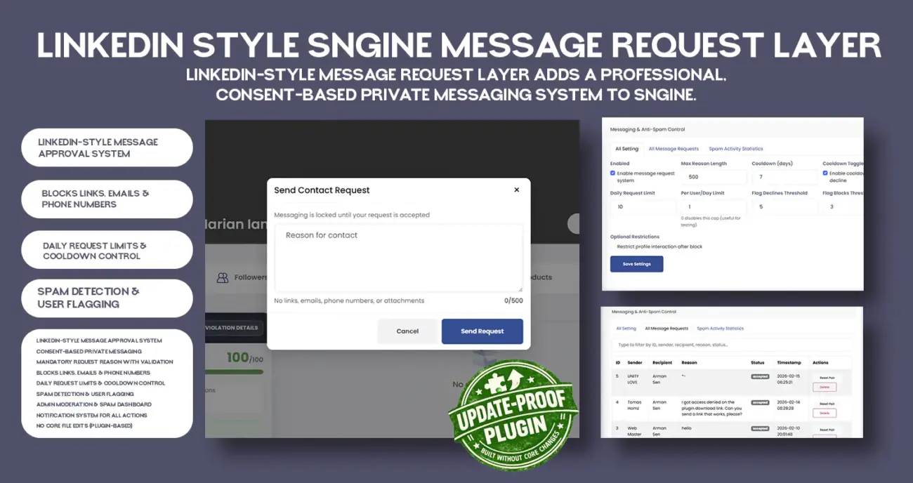 LinkedIn-Style Message Request Layer adds a professional, consent-based private messaging system to Sngine.
